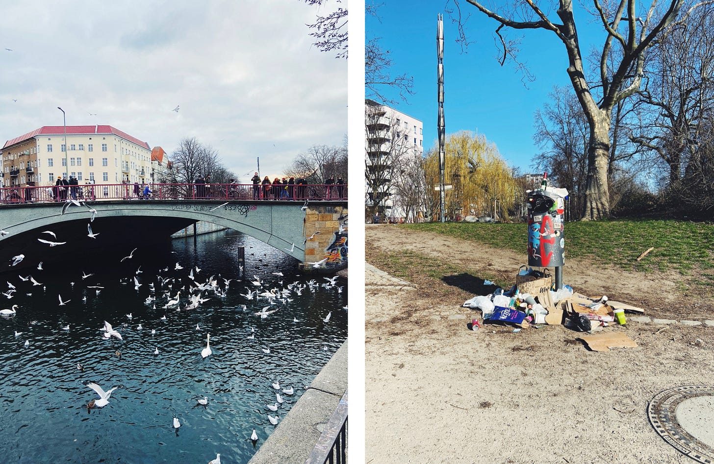 Between work and meeting up with people, I’ve spent a lot of time walking around the neighborhood, taking in the buildings and proliferation of trash and the crocuses jutting up through the hard earth. Kreuzberg is the area I first lived in, and I’ll only be here another couple weeks before going to the opposite side of the city so I’ve been staying close by on my various jaunts, cutting down the wide tree-lined park from Oranienplatz to the swan-flecked Landwehrkanal, or walking through Mariannenplatz (where I saw a naked man scurrying behind a tree the other day) to my beloved Markthalle Neun for groceries.
